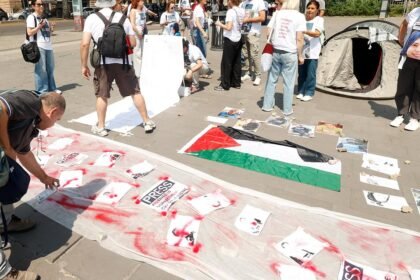 “Gazze için Enformasyon Çalışanları” isimli grup üyesi basın mensupları, başkentteki Porta San Giovanni Meydanı’nda, Gazze’de İsrail saldırılarında hayatını kaybeden aral...