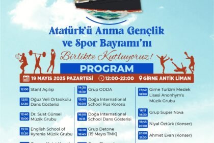 19 Mayıs Atatürk’ü Anma, Gençlik ve Spor Bayramı dolayısıyla Girne Antik Liman’da etkinlikler düzenlenecek. Girne Belediyesi’nden yapılan açıklamaya göre, program, 19 Mayıs Pazartesi günü saat 12.00’d...