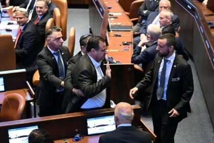 Trump, İsrail parlamentosuna hitap ettiği sırada milletvekilleri Avde ve Cassif, Filistin’in tanınmasını talep eden pankartlar açtı. “Filistin’i tanıyın” yazılı pan...