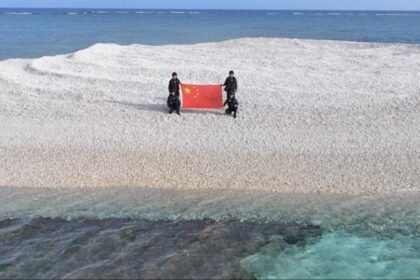 Çin devlet medyası, Çin Sahil Güvenliği (CCG) personelinin, Güney Çin Denizi’nde Çin’de Tiexian Resifi olarak bilinen Sandy Cay’e Çin milli bayrağını dikerken çekilen fotoğrafl...