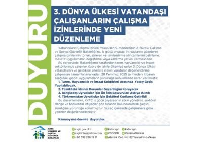 Çalışma ve Sosyal Güvenlik Bakanlığı, üçüncü dünya ülkesi vatandaşlarının, çalışma izinleri konusunda yeni düzenleme yaptı. Bakanlıktan yapılan açıklamaya göre, yeni düzenleme çerçevesinde tarım, hayv...