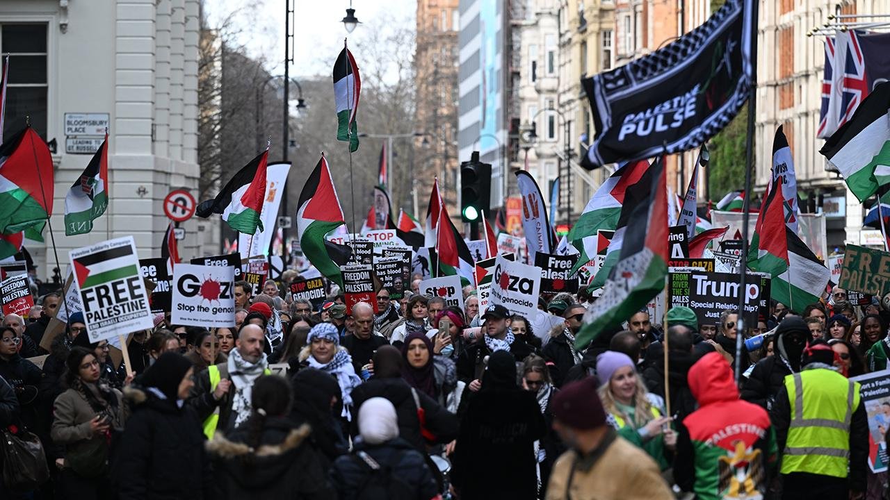İsrail’in Filistin halkına karşı işlediği soykırım devam ettiği gerekçesiyle düzenlenen ulusal yürüyüşe katılan eylemciler, İngiliz hükümetinin İsrail’e silah satışlarına devam etmesine ve Gazze’de ateşkese rağmen İsrail saldırılarının sürmesine tepki gösterdi.